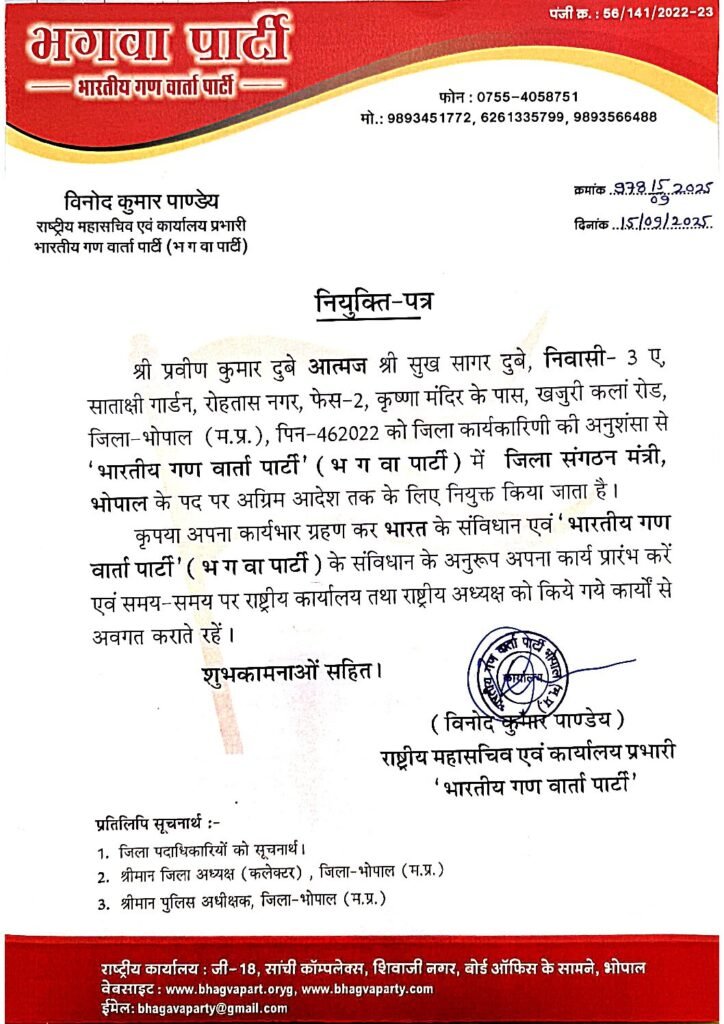 श्री प्रवीण कुमार दुबे जी को भगवा पार्टी में जिला संगठन मंत्री भोपाल के पद पर नियुक्त किए जाने पर ढेर सारी बधाई एवं शुभकामनाएं।